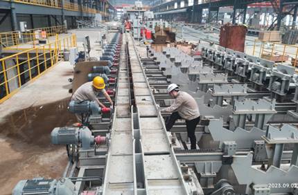 生產線靠前的連軋區域因賽迪裝備成熟而豐富的工程經驗進展很順利,各項指標均達到設計要求。然而9月18日臨近熱試節點時,采用新工藝的編組區與冷床區因小問題疊加,調試時液壓缸損壞出現了漏油情況。為了確保20日的熱試節點“后墻不倒”,張程霖、周德洪、程江、夏棋、高陽5名設計當天連夜收集現場流體液壓參數和應用數據,在沒有經驗可循的情況下逐個進行分析、驗證,加班加點制定出2套備用整改方案。19日,團隊10余人擰成一股繩,在臨時黨支部書記、項目經理趙遠峰帶領下,黨員同志董立蘇、張程霖、高陽、張子念、周德洪等人充分發輝先鋒模范作用,帶頭逐一復核尺寸、校對液壓參數,期間累了,就和著紙板鋪地上簡單休息一下,午餐晚餐也是匆匆扒幾口盒飯繼續投入戰斗。最終在“早八對早八“的通宵達旦拼搶下,編組與冷床區具備了熱試條件,于20日晚一次性熱負荷試車成功。
