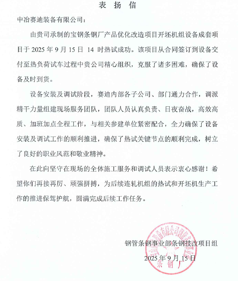 2025年9月15日,中冶賽迪裝備收到來自寶鋼股份鋼管條鋼事業部條鋼技改項目組的表揚信,對公司在寶鋼條鋼廠產品優化改造項目開坯機組設備成套項目中的出色表現和重要貢獻予以充分肯定和贊揚。